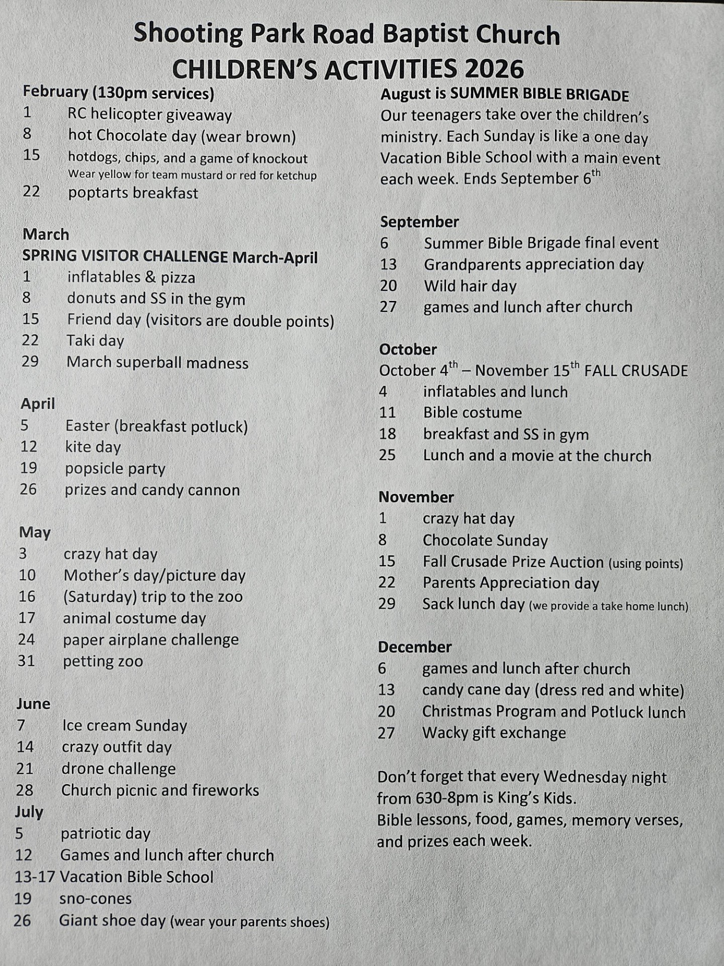 Kids will enjoy Sunday school classes by age each Sunday morning along with Jr. church classes during the morning service. We also have King's Kids for 6–12-year-olds and Frogs of Faith for the 3–5-year-olds each Wednesday night. Wednesday nights we have snacks, play games, have a Bible lesson, and work on memorizing God's Word. Our adult service, on Wednesday night, gets done a little early and any adults who would like to help the kids with their memory verses. We also have a staffed nursery for all services. There are MANY "extra" activities for the kids each month including monthly "fun days" hosted by different church families, Vacation Bible School, Family fun Fest, Prize weeks to reward Bible memorization, and much more.